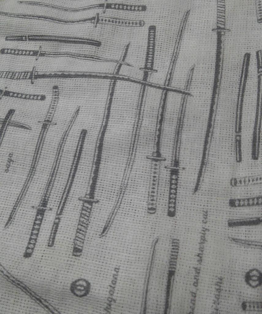 セリアで、鐔と紋ぽい柄の手ぬぐいあって買っちゃったんだけど、これでマスク作ったらちょっと派手かな…。刀の柄はストレートすぎるなと思って買わなかったんだけど